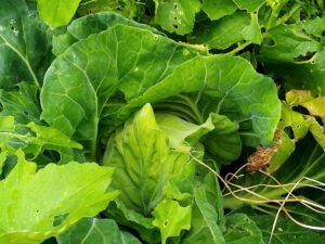 プランターで中々生長できなかった金系201号は2株残りました。ネットも掛けていませんが、今年は垂直仕立て栽培をしていないから紋白さんの洗礼を受けています。右の方が結球が確りしていますね。