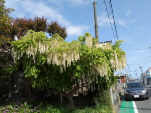 左: 今年も白藤カピタンが西忠さんの斜向かいのお宅で綺麗に咲き始めました。ミツバチが忙しく飛んでいます。