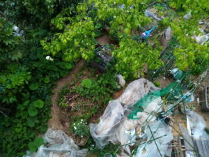 ごちゃごちゃが更にごちゃごちゃ感を増していますが、茄子に防寒/防霜中は仕方がないですね。ごちゃごちゃに見える処は生姜プランターです。未だ茄子苗は定植はしていませんが、外の環境に慣れて貰うために庭に出しました。定植は同じ場所になります。
