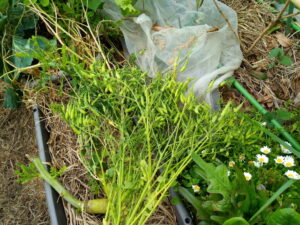 大根の種は紐で縛って支柱に吊るして置きましょう。左が恐らく耐病巣太り、右が味ゆたかです。