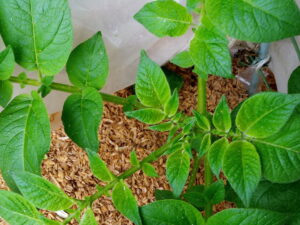 中: 脇の通路の籾殻袋の行灯に入れたジャガイモは一昨日籾殻を足しましたが、もう伸びています。
