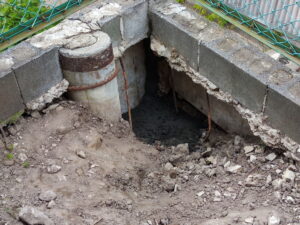 私の見た処では地表面(一番上のブロックの下の線)まできっと生コン80-100㎏位必要なのかな。