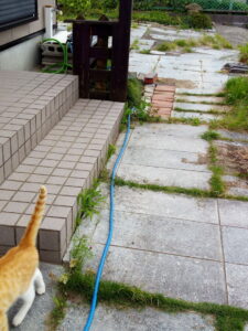 9時、玄関を開けると何やら怪しい風体の男性が二人、西隣さんのお水を使っていました。えっ!?誰!?『どのようなご用件ですか?』と伺うと裏に生コンを打つという返事でしたので、納得。よろしくお願いいたします、と伝えました。あ~、(+_+)した。