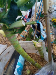 中&右: 中が今年の秋冬のロマネスコ。右が今年1月に収穫した茎で新芽が出ていたのをダンゴムシが食べてしまいました。比較してみると行灯で垂直仕立て栽培みたいになっている方が青虫の食害に在っても強いです。