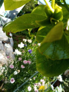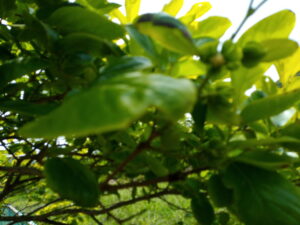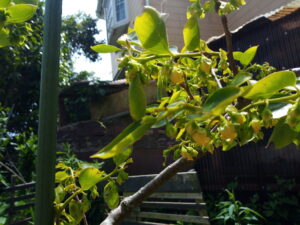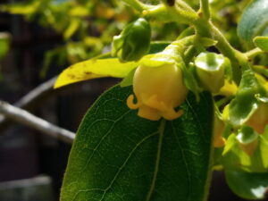 中&右: 我が家の禅寺丸柿です。今朝、花が緑から黄色になりました。熟しましたね。これです、これです!私が探していたのは。緑色の花が出来てから2-3週間かかるのですねぇ。これは暖かい氣温が齎すものなの?