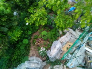 左: 風で大きく柿の枝が揺れてぶれています。大西条柿の枝は地上70㎝位まで葉の重みで垂れています。今年は色々な意味で初年度ですから、私もどう動いて良いのか正直分からない部分があります。冬の間、外猫達の防寒で使った籾殻は少しずつジャガイモに施しています。ある程度風化しているので丁度良い状態です。梅雨に入るまでは生姜の農ビは外せないでしょうねぇ。ここにも籾殻と土を入れて行きます。