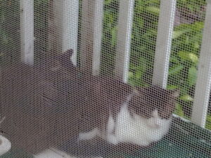 17時過ぎ、階下でガッチャーンと金属の重たいものを落とした音がしました。白黒猫かな。一階に降りていくと出入り口に白黒の背中がちらりと見えました。庭へ回ったので東の窓を開けて待ち構え、猫小屋に白黒猫が飛び上がって来たところで、ヘッ、ヘッ、ヘ…。と妖怪風にやってやりました。飛び上がって逃げてキョン網でスッタモンダ、ともがいて行きました。笑笑