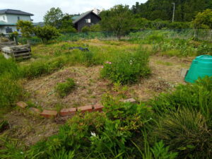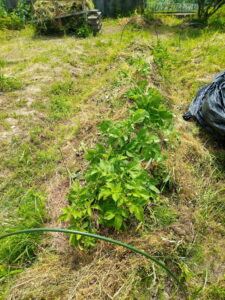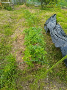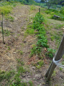 中: 温州さんの右側の葱と一緒の畝のジャガイモにも掛けました。写真には無いけれど、先日Kさんが植えたジャガイモにも2回目の草を掛けました。