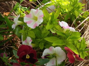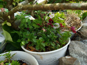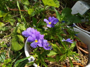 白躑躅下に庭から引っ越してきたパンジーの復活です。