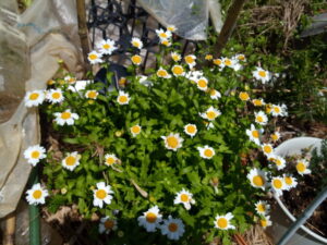 右: 今年4回目の開花です。確か6月まではジュリアンさんは咲いて呉れます。ハコベに囲まれても!