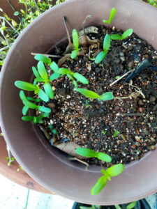左: 今見えているのはすべてマリゴールドアイシスです。小さい発芽が見えていますが、それがサルビア混合?楽しみ!