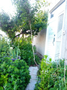 左: 剪定後、午後の光が回って来ました。玄関前。ヤナギハナガサの花が今朝よりもたくさん開いています。