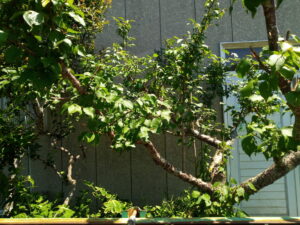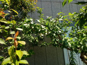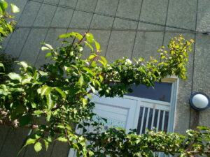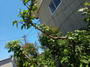 右: 西隣さんのスロープから。上に立ち上がった枝は極力減らしました。7月8月の花芽分化が焦点です。若葉が見えているのは鹿児島紅です。枝が出来るだけ紫外線で傷まずに花芽分化が有利に行われるような感じにしました。勿論、梅雨時にはまた生長しますので、観察は必須です。