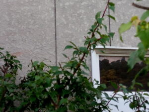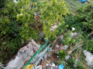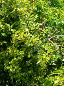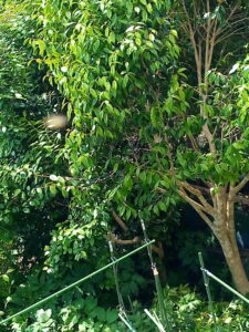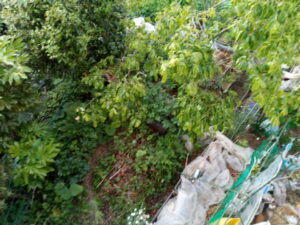 右: 見て!枝と枝の間に太い紐みたいな藪枯らしが伸びています。氣付かない内に長く高い処まで上がっていて、エイヤッ!と引きずり落としました。長いのは切った処だけで軽く2mもありました。一日でどれだけ伸びるのよ。