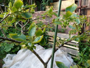 左: 突き出たこの枝は昨年育てた垂直枝。V字になった反対側は切ったけれど、何故か残った枝。後で切ります。