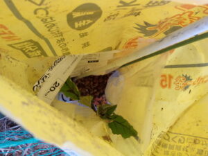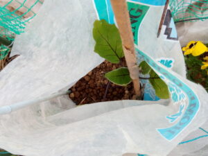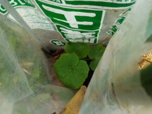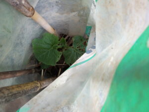 中: 南瓜の地面に近い葉はダンゴムシに喰われています。後で海水EM活性希釈液を掛けて上げよう。完了!