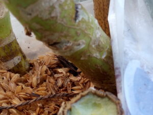 左: ロマネスコの茎に膨らんでいるのは芽かしらねぇ?上の枯れたものではなくて、その下の膨らみね。