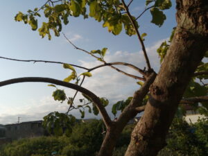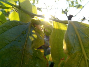 左: 大西条柿の東側に小さな柿の葉が出て来ました。そうよ、そっち側に延びて頂戴。