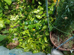 左: 東の紅椿を切りました。中央やや右寄り。次に切るのは左側の椿です。小枝はすべて落として色々な畝に敷きます。(右)椿の葉はクチクラ層が厚いので、長持ちします。太枝は、と言ってもそれほど長くも太くもないので、茄子の支柱にします。