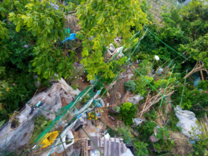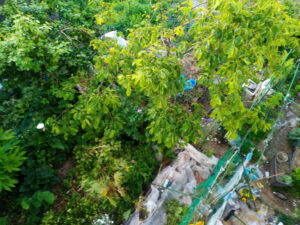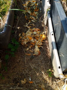 右: 無農薬生ごみを一旦通路で乾かします。ほぼ夏蜜柑と緑茶です。カラッカラに乾いたら畝に置きます。