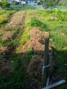 中: その隣の晩生ジャガの畝は出ている処だけ刈草を置きました。
