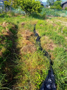 一昨日Tさんが刈った原っぱの刈草を、庭中の畝や庭木の根本に敷きました!|