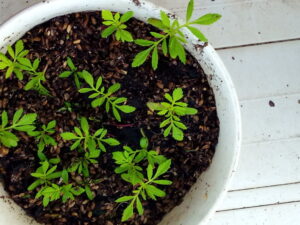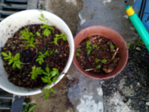 中: サルビア混合です。昨夕、18時過ぎてからマリゴールドアイシスを独立させました(右ですが、頁一番上の写真と比べるとシャッキリしていませんか?)が、急に背丈が昨夜の内に伸びました。ハコベが3つ程一緒に発芽しています。ハコベは生長が早いので、後で抜いてしまいます。
