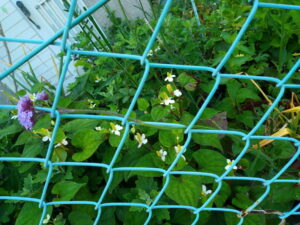 中: この金網は昔空気に触れさせるタイプの生ごみコンポスターだったものです。ペンチで針金を解くのが面倒臭くて放ってありますが、右の写真の基礎をこれで作ります。
