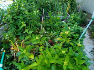 右: 菊やドクダミをピンチすると奥の鉢のロシアセージが出て来ました。