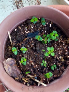 中: サルビア混合です。昨夕、18時過ぎてからマリゴールドアイシスを独立させました(右ですが、頁一番上の写真と比べるとシャッキリしていませんか?)が、急に背丈が昨夜の内に伸びました。ハコベが3つ程一緒に発芽しています。ハコベは生長が早いので、後で抜いてしまいます。