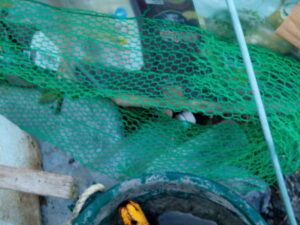 中: この金網は昔空気に触れさせるタイプの生ごみコンポスターだったものです。ペンチで針金を解くのが面倒臭くて放ってありますが、右の写真の基礎をこれで作ります。