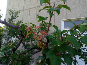 左: 実梅の西隣さんよりの枝を切ったら周りに新芽が出て来ました。
