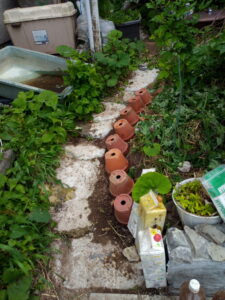 右: こちらは5号駄温鉢を退けて、少し掘って金網を入れてから捨てコンをして玉竜を生けようかな。未だ少し先の仕事ですが雨の具合によりますね。