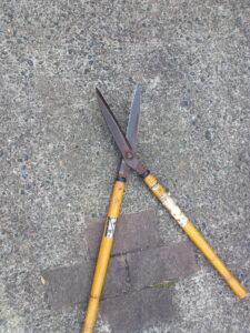 右: これが今回大活躍して呉れた庭ばさみ。一応包丁研ぎで研いで、捨てるつもりだったごま油(圧搾ではなく、溶剤を使っている疑い)を塗りました。