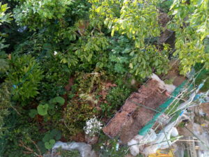 右: こちらは5号駄温鉢を退けて、少し掘って金網を入れてから捨てコンをして玉竜を生けようかな。未だ少し先の仕事ですが雨の具合によりますね。