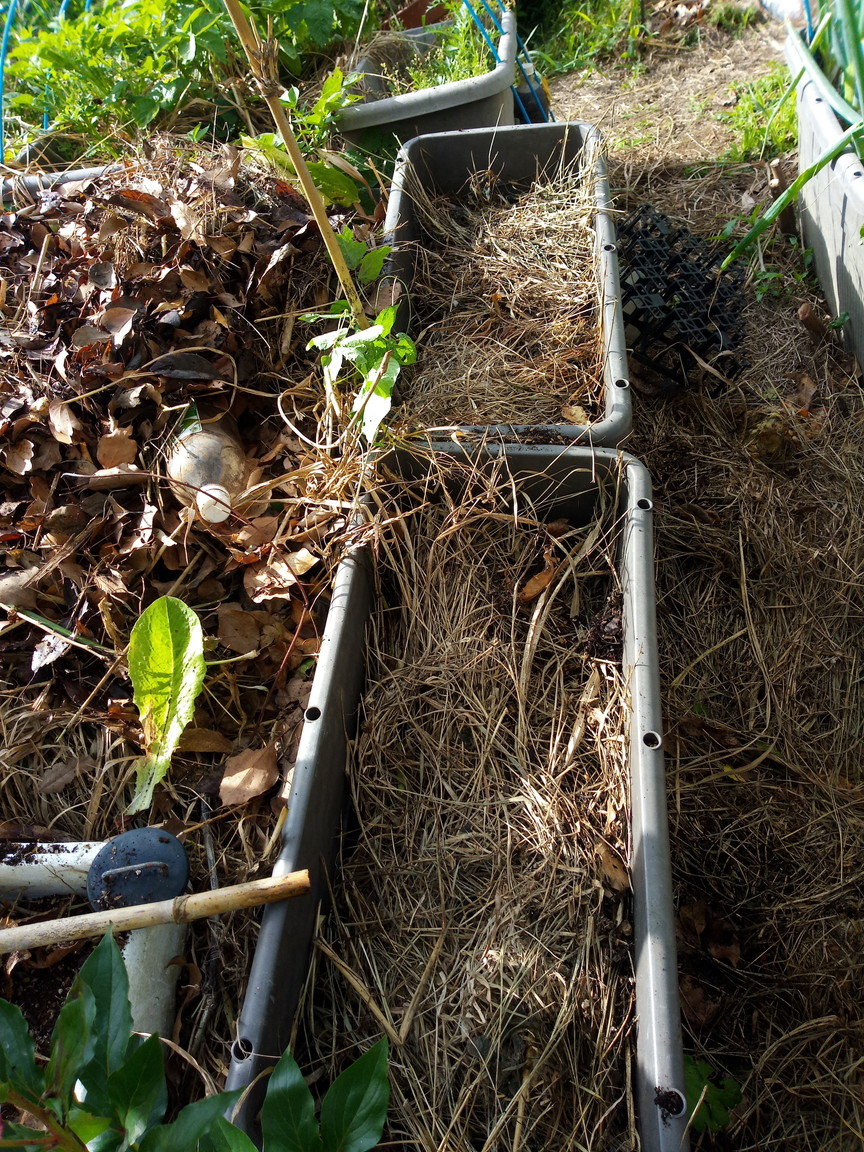 プランター2本の大蒜の植え床には上に敷き草をたっぷり載せます。