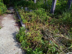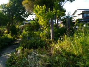 中: 門の入ってすぐの萱とセイタカアワダチソウ等背の高いものは切りました。その先も通路際1m程セイタカアワダチソウを切りました。何処でもセイタカアワダチソウがありますね。これって地下茎ですよね。