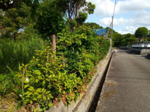 溝の清掃までにやっておきたいのが左と中。植栽が塀から飛び出しているところ。これは空き家感半端ない。