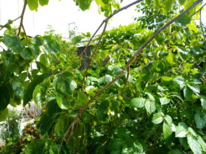 右: 柿木が枝垂れていますが、真ん中に見えるジャガイモデストロイヤーの花を撮りました。笑 見え難くてすみません。花が3か所に上がっています。