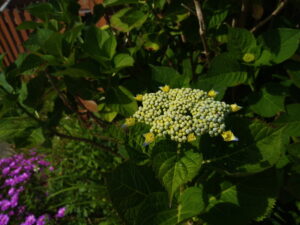 左: ピンク紫陽花の親株の花。この花特有の形が見えて来ました。