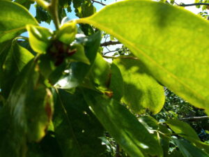 右: 西条柿の花の茶色い花びらが取れて実が顔を覗かせています。感謝!この姿を見るのは実に5-6年振りです。しかもその柿は台風の風で落ちてしまいました。