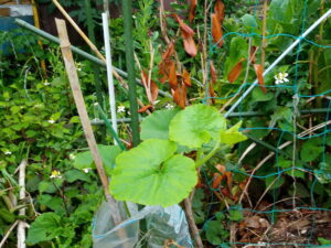 左: Iさんから頂いた南瓜苗が生長して来ました。一つは行灯から早抜け出し、ネットを手繰り寄せています。