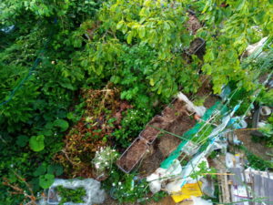 左&中: 台風に備えて白躑躅の脇を臨時に整えました。掘って500mlペットボトルで土留めをし、玉竜と沢山発芽した秋海棠と菊の挿し木をしました。将来的には500mlペットボトルより少し背が高い牛乳パックか何かをモールドにしてモチーフを作りたいですね。反対側も取り敢えずペットボトルになるかな。午後には猫の出入り口の箱にロープを掛けます。ペットボトル土木?はとても便利なんですよ。