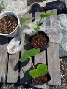 左: 胡瓜夏涼みは日光浴です。後で植えて行灯に入れるか、雨が通り過ぎてから植えるか、思案どころです。鉢増しして家の中で過ごして貰いましょう。日曜日に植えます。