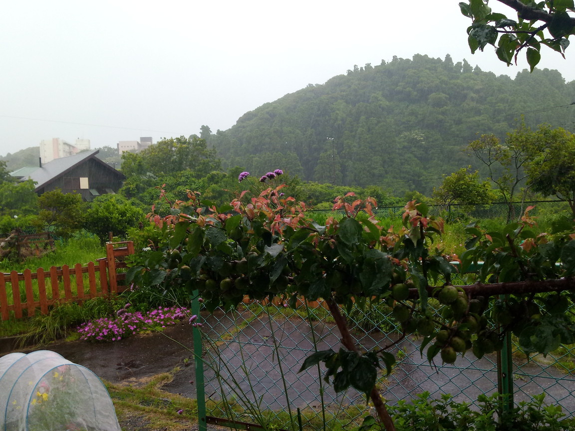 左: 西隣さんの紫陽花。梅が完熟で落ち始めました。ここ一週間落ちないので安心していたら、昨日の台風の雨を吸収して赤い梅がぽたぽた落ちていますよ。一週間前に拾った落ち梅と全然違う完熟梅ですので、西隣さんはコレを見たら、お忙しいとは思いますが収穫にいらして下さい。今まで来ていなかったのに、今日は20個位ありました。これからどっと来そうな感じです。