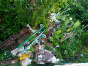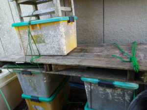 右: 猫の出入り口も今回は最大12m(最大瞬間風速18m)程度の風でしたので、ロープは買ってありましたが、縛っていませんでした。今朝、確り下の箱から全部縛りました。塗装は暫く後になりますが、このまま、出来るだけ丁寧にやって行きます。
