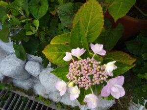 中&右: 我が家のピンク紫陽花の親株。