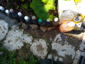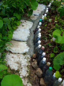 左&中: 初夏の台風は計算に入っていなかったので、先ず、手を打ちました。躑躅脇の土留めに捨てコンを流しました。後50㎝の処でコンクリートが無くなってしまいました。今回はインスタントセメント3㎏位使ったのかな。捨てコンをやりながら、赤紫蘇を定植したり、ニガウリの行灯を掛けたり、胡瓜を行灯で定植したり、と2時間位遊んでいました。10時半前に鏝を掛けて来ましたが、一回目に打った処は既に固化が始まっていました。氣温が高いから早いです。二回目に打った処は丁度良い固化の加減で鏝を当てると水分がじわっと出て来ました。3回目の処は未だ形の修正が効く柔らかさでした。