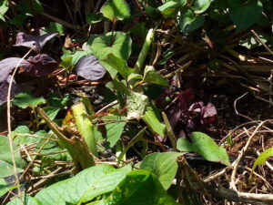 左: 今年は赤紫蘇に失敗したので、お隣から頂いたものを畝に植えました。左側は元々生えていた赤紫蘇です。