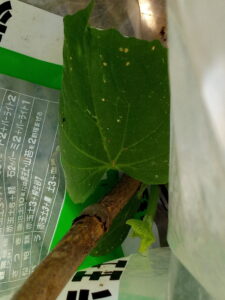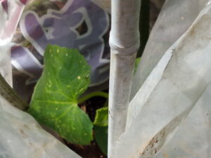 支柱に100均のネット(10×10㎝枡)を一枚だけ張りましょう。南瓜が伸び始めました。南瓜が進む方向にネットを増やして行きます。